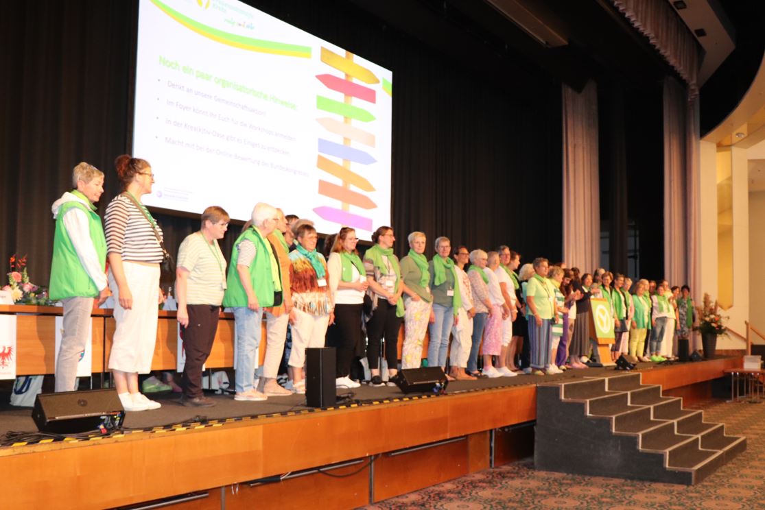 Die Bilder von links nach rechts: Staffelübergabe von der alten zur neuen Bundesvorsitzenden; neue Mitglieder werden auf der Bühne begrüßt; Blick ins Plenum; Bundesvorstand von 2020-2024.