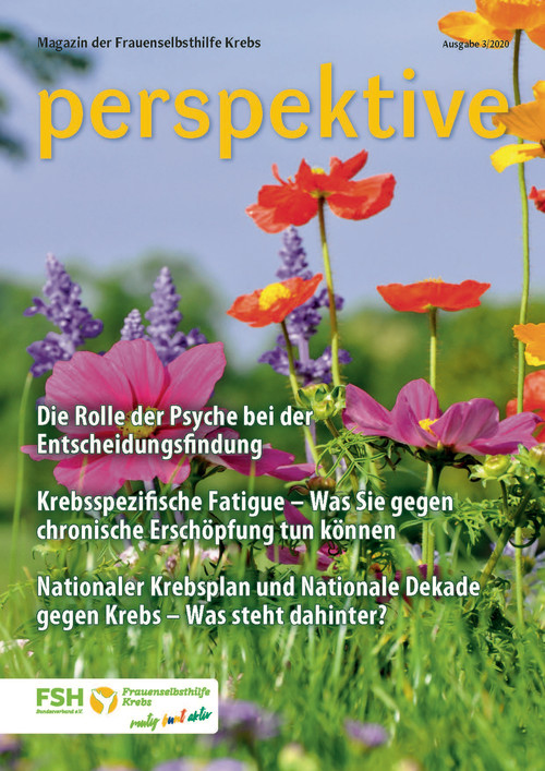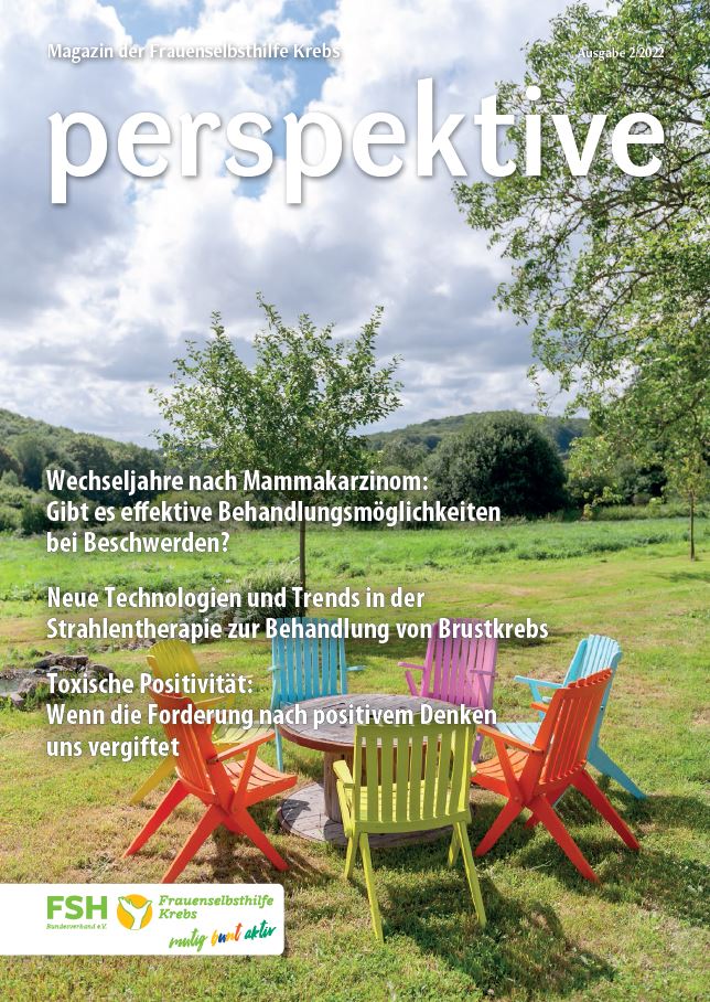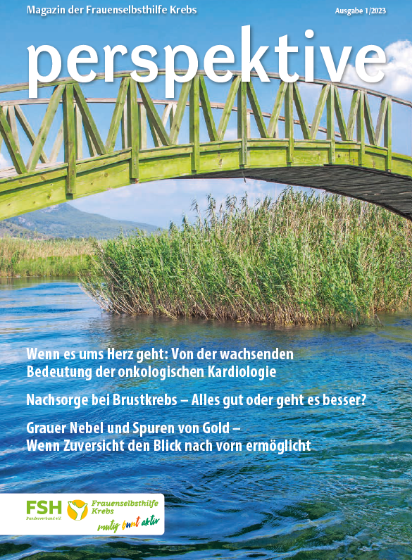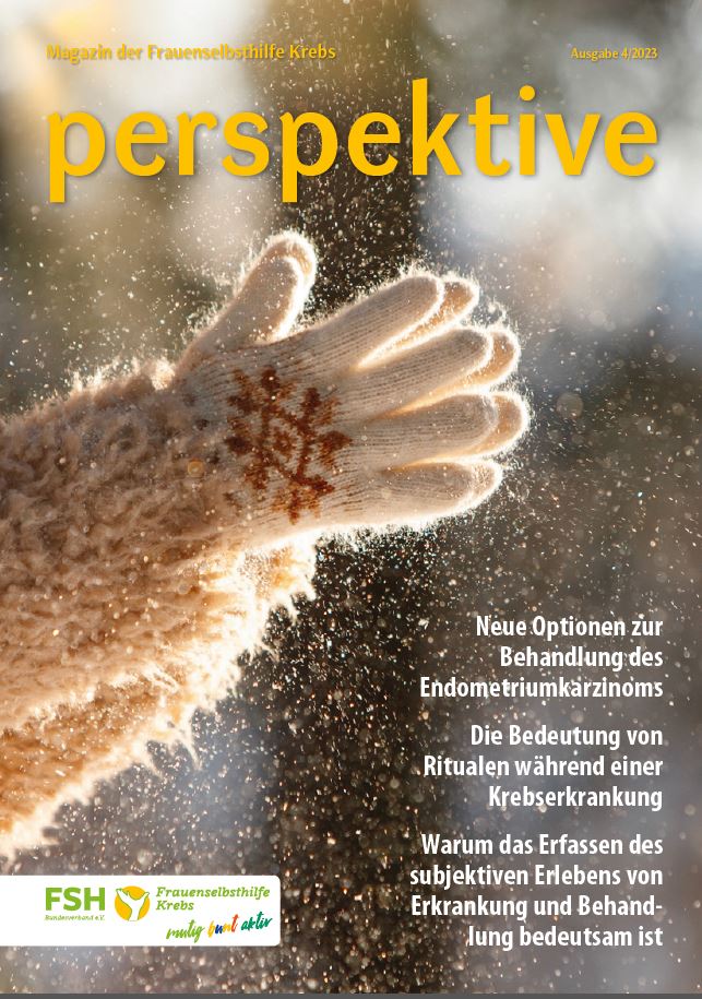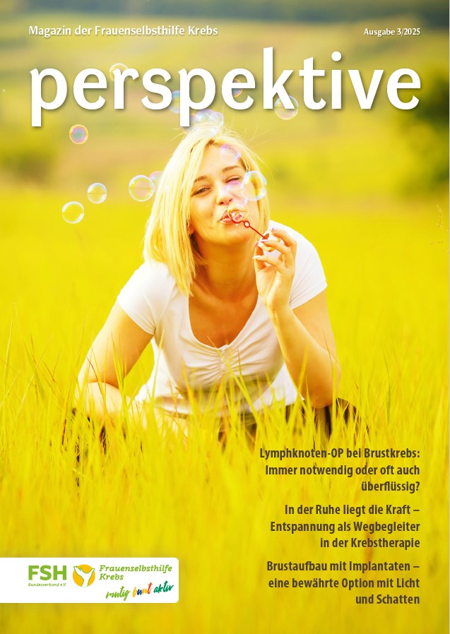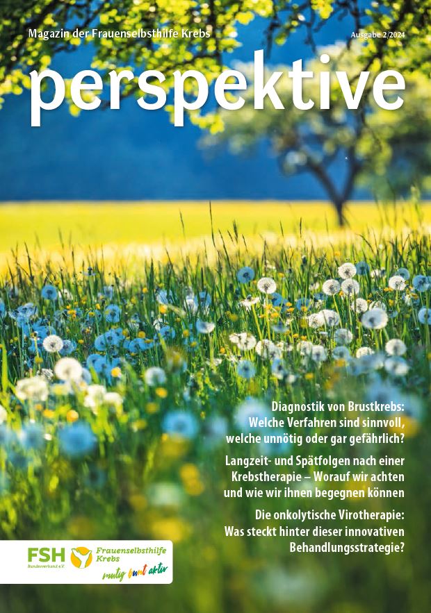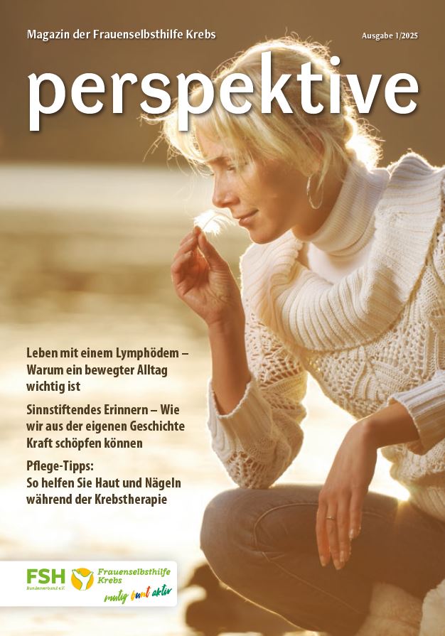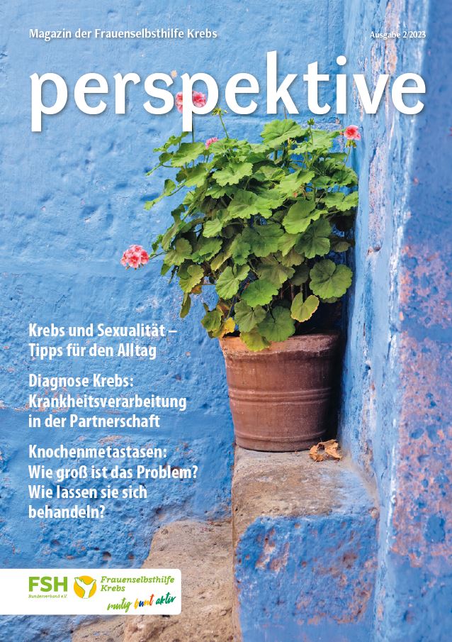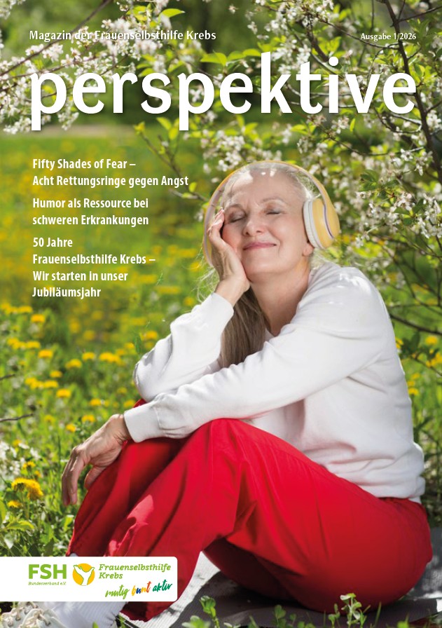 Viermal im Jahr erscheint das Magazin der Frauenselbsthilfe Krebs "perspektive". Ein wesentlicher Teil des Heftes umfasst Hintergrundinformationen zum Thema Krebs und Tipps für Betroffene. Außerdem wird über Entwicklungen im medizinisch-pflegerischen Bereich und in der Gesundheitspolitik berichtet. In jedem Heft finden sich zudem Beiträge über das aktive Vereinsgeschehen, Termine und Standpunkte der FSH. Die perspektive schicken wir Euch gerne kostenlos zu. Bitte füllt dazu das Bestellformular aus. Ihr findet die Bestellmöglichkeit ganz unten auf dem Formular.