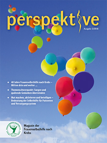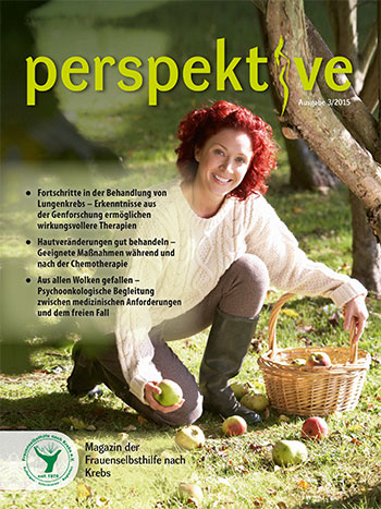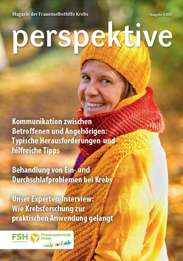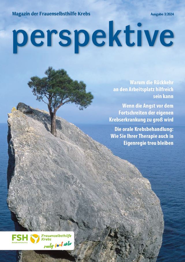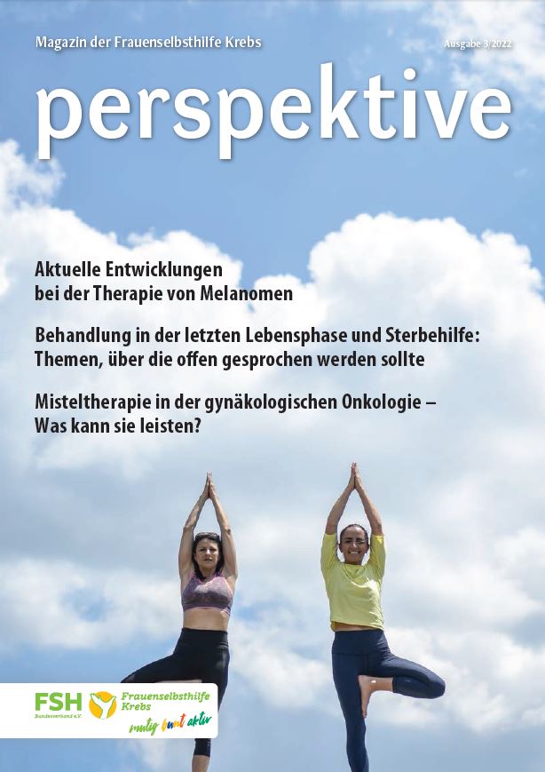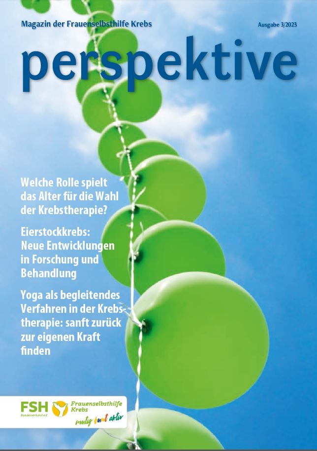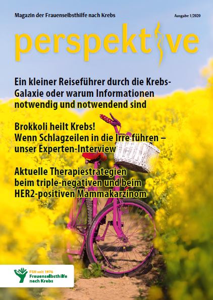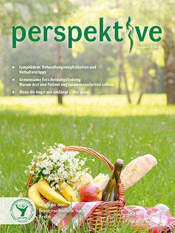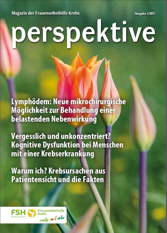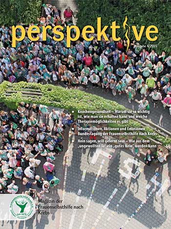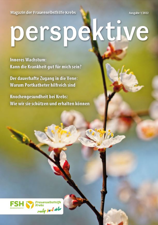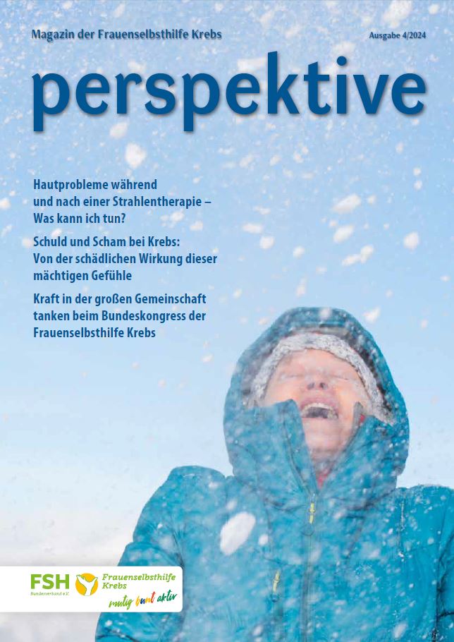 Viermal im Jahr erscheint das Magazin der Frauenselbsthilfe Krebs "perspektive". Ein wesentlicher Teil des Heftes umfasst Hintergrundinformationen zum Thema Krebs und Tipps für Betroffene. Außerdem wird über Entwicklungen im medizinisch-pflegerischen Bereich und in der Gesundheitspolitik berichtet. In jedem Heft finden sich zudem Beiträge über das aktive Vereinsgeschehen, Termine und Standpunkte der FSH. Die perspektive schicken wir Euch gerne kostenlos zu. Bitte füllt dazu das Bestellformular aus. Ihr findet die Bestellmöglichkeit ganz unten auf dem Formular.