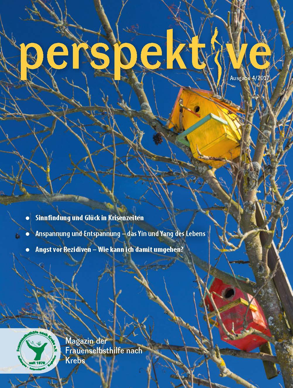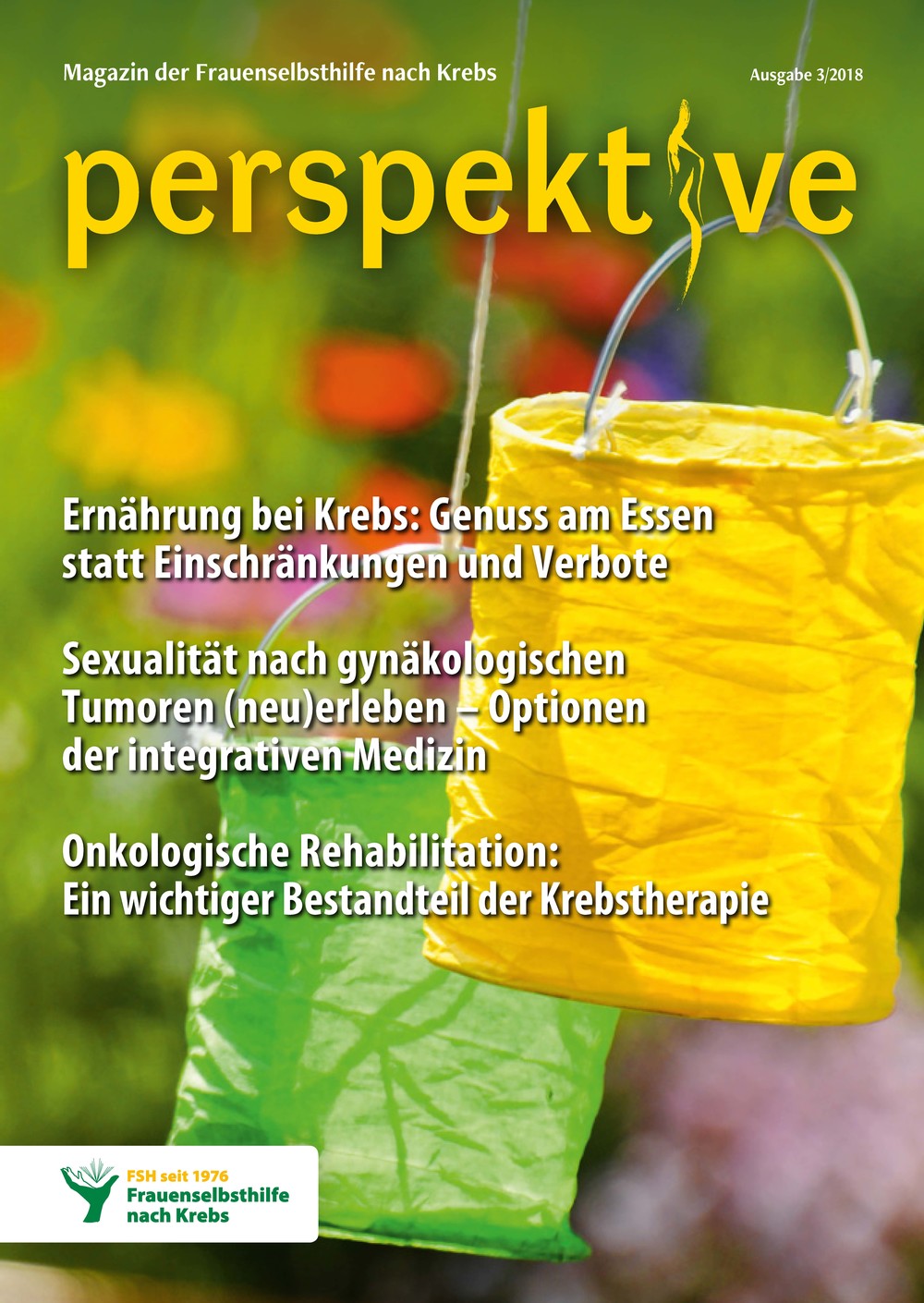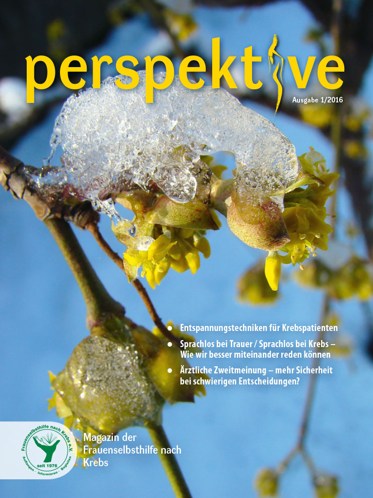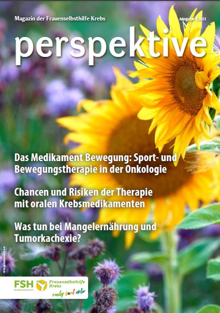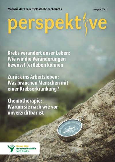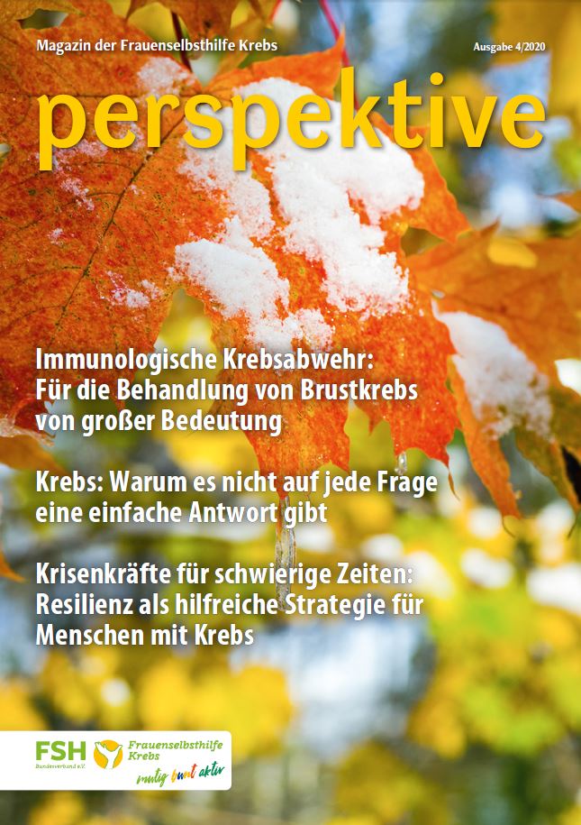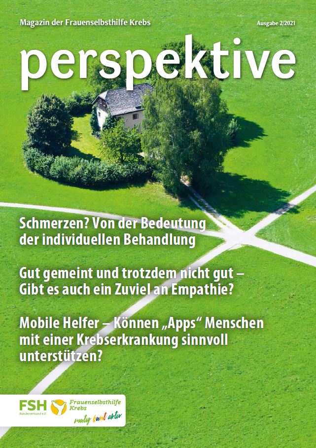 Viermal im Jahr erscheint das Magazin der Frauenselbsthilfe Krebs "perspektive". Ein wesentlicher Teil des Heftes umfasst Hintergrundinformationen zum Thema Krebs und Tipps für Betroffene. Außerdem wird über Entwicklungen im medizinisch-pflegerischen Bereich und in der Gesundheitspolitik berichtet. In jedem Heft finden sich zudem Beiträge über das aktive Vereinsgeschehen, Termine und Standpunkte der FSH. Die perspektive schicken wir Euch gerne kostenlos zu. Bitte füllt dazu das Bestellformular aus. Ihr findet die Bestellmöglichkeit ganz unten auf dem Formular.