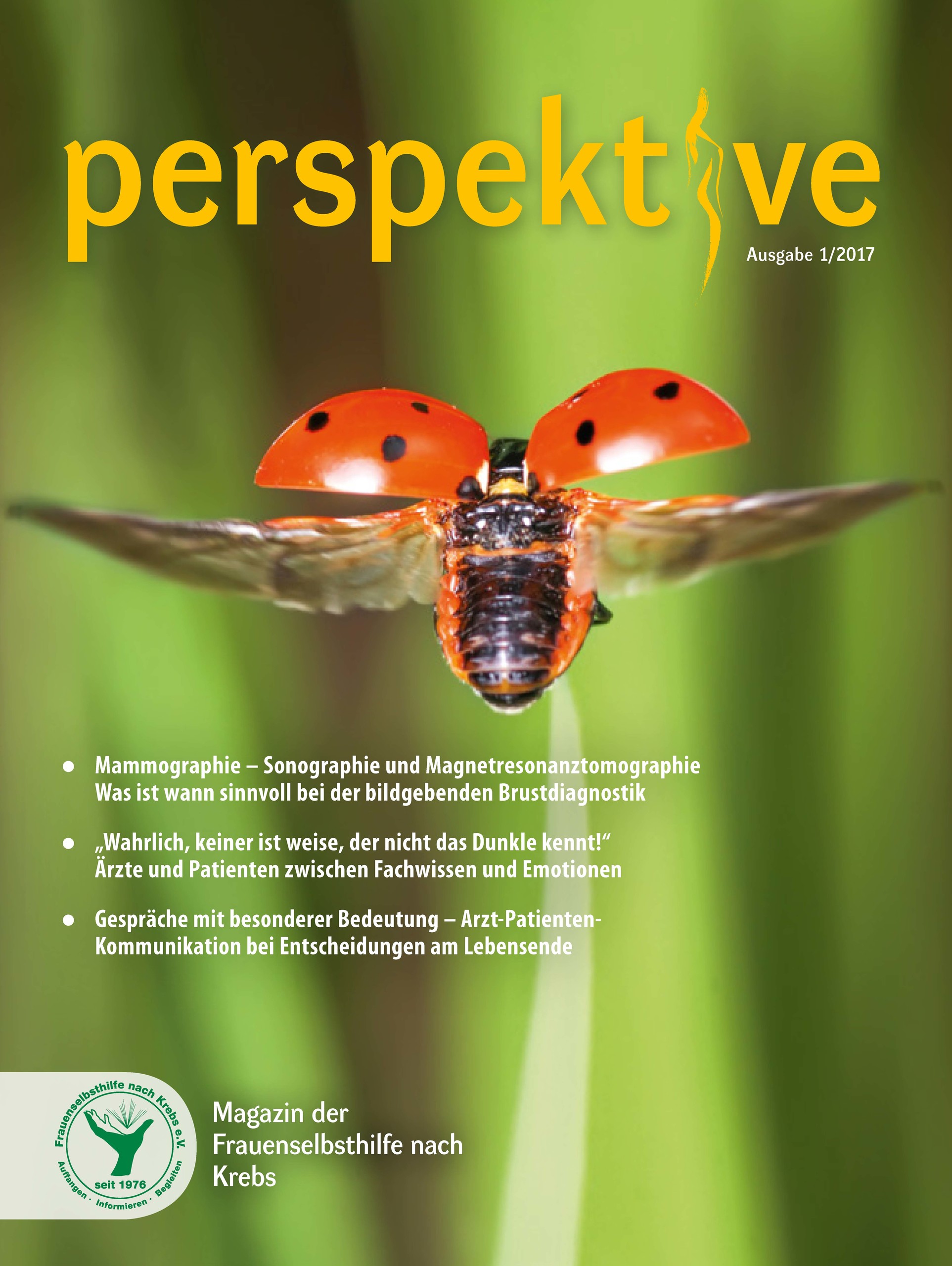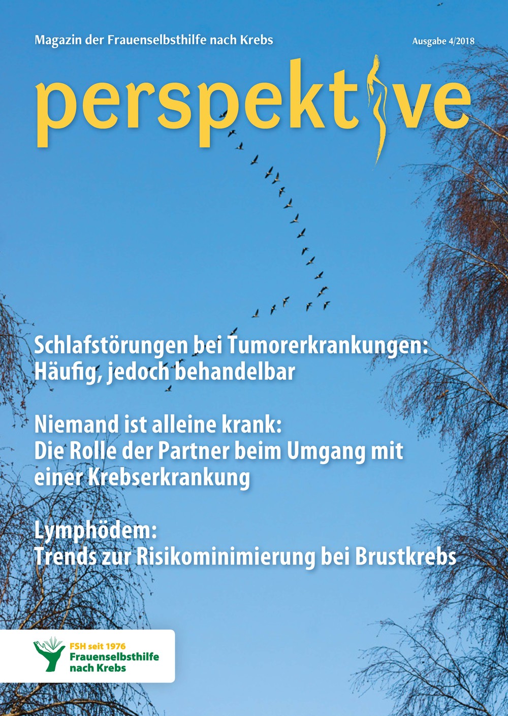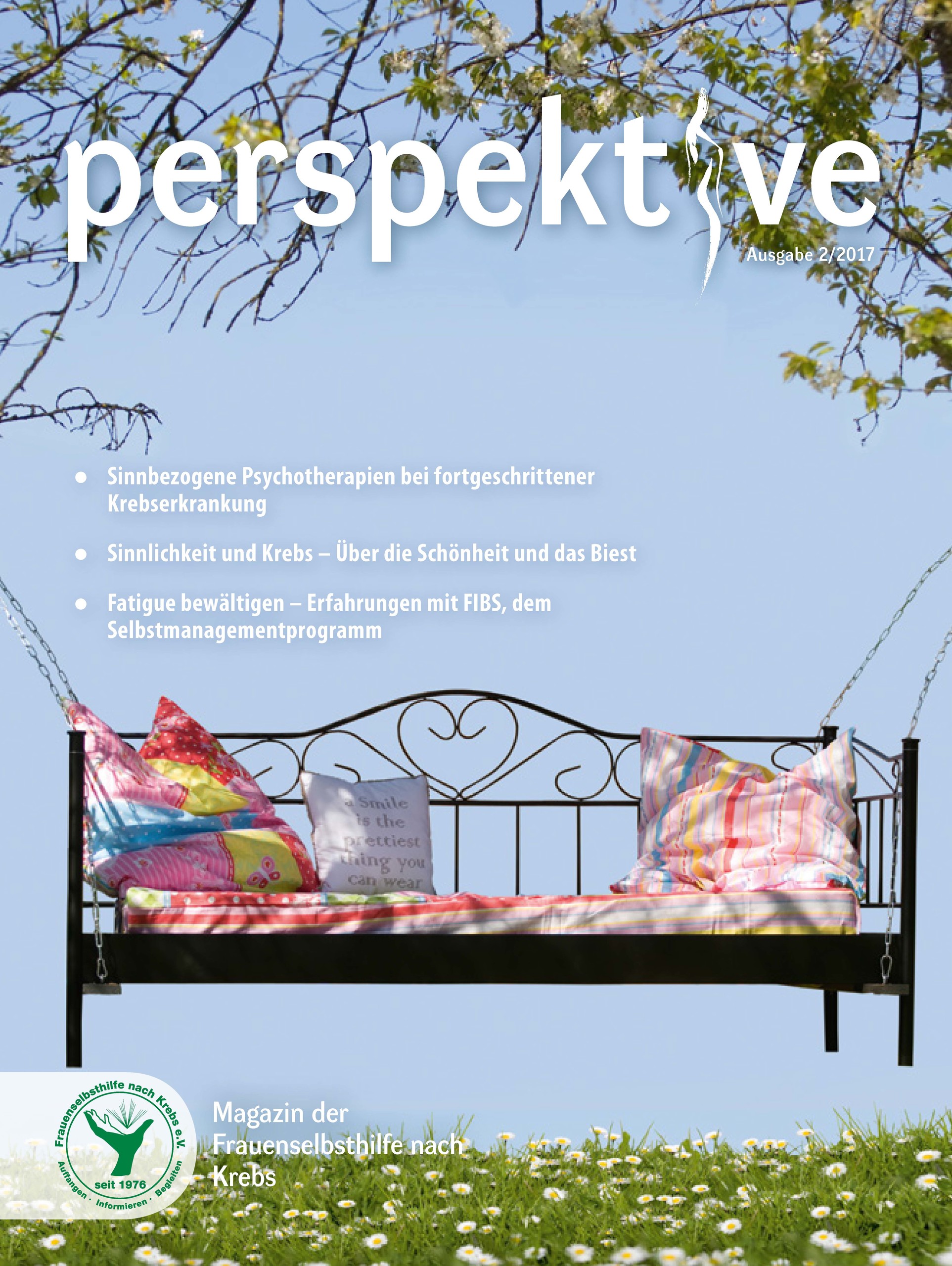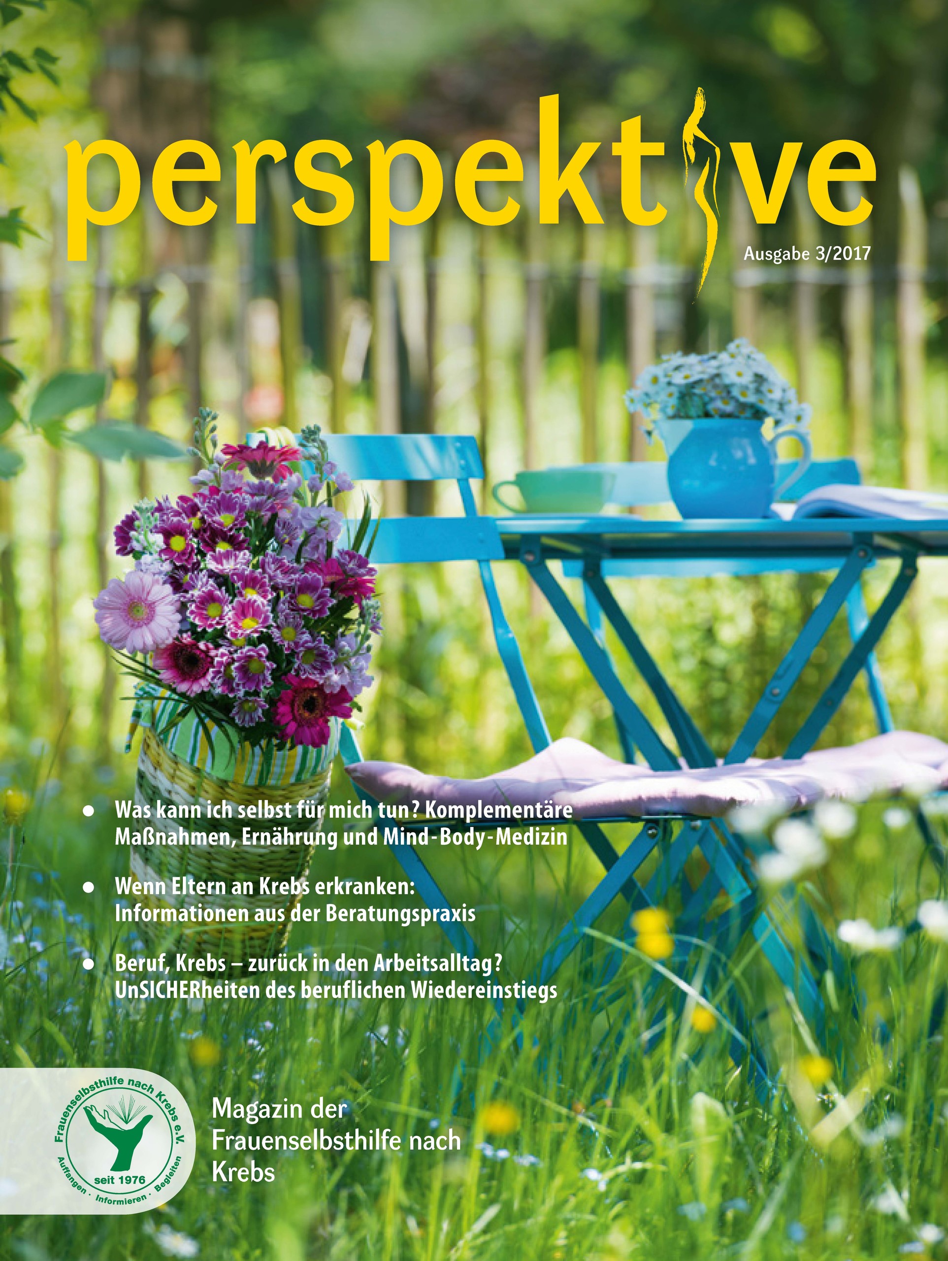 Viermal im Jahr erscheint das Magazin der Frauenselbsthilfe Krebs "perspektive". Ein wesentlicher Teil des Heftes umfasst Hintergrundinformationen zum Thema Krebs und Tipps für Betroffene. Außerdem wird über Entwicklungen im medizinisch-pflegerischen Bereich und in der Gesundheitspolitik berichtet. In jedem Heft finden sich zudem Beiträge über das aktive Vereinsgeschehen, Termine und Standpunkte der FSH. Die perspektive schicken wir Euch gerne kostenlos zu. Bitte füllt dazu das Bestellformular aus. Ihr findet die Bestellmöglichkeit ganz unten auf dem Formular.
